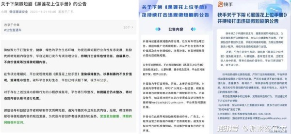 最新爆款短剧《黑莲花上位手册》被全网下架是业内一大标志性事件。11月21日,微信、抖音、快手等平台不约而同发布通知,微短剧《黑莲花上位手册》因渲染极端复仇、以暴制暴,是非观念混淆,已经全部进行下架处理。