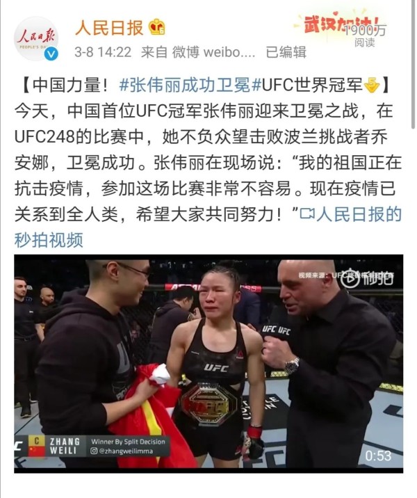 张伟丽成功卫冕UFC世界冠军。(看她个人经历,真的很励志,特别燃,特别棒!)