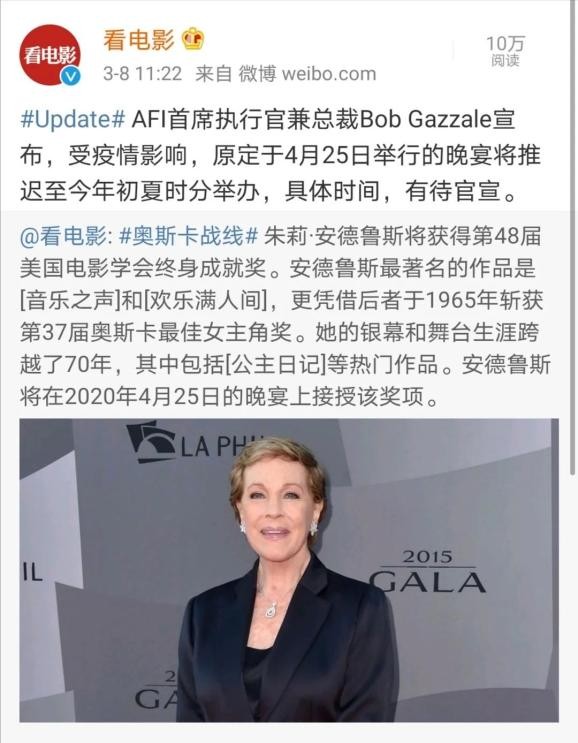 受疫情影响,4月25日举行的美国电影学会晚宴将推迟至今年初夏时分举行。