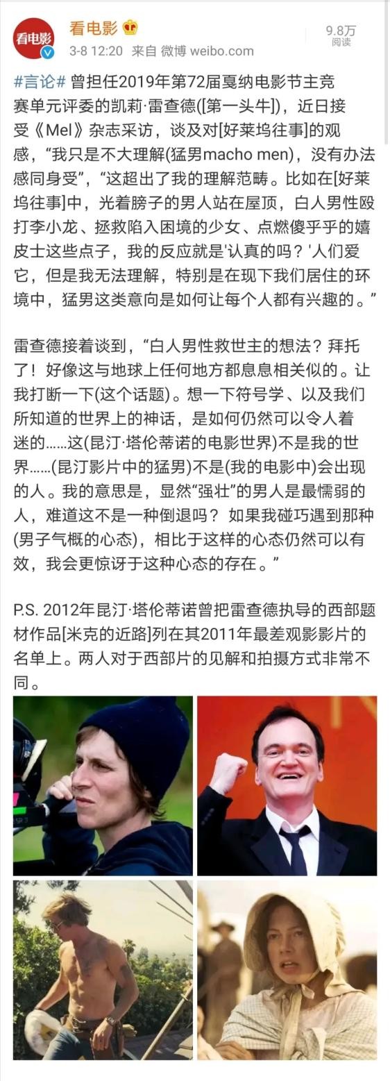 曾任2019年第72届戛纳电影节主竞赛单元评委的凯莉·雷查德,近日接受《Mel》杂志采访,谈到了对[好莱坞往事]的感受: