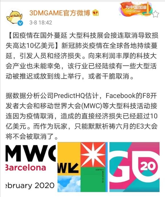 受疫情影响,大型科技展会接连取消,包括“脸书”的F8开发者大会、移动世界大会等,直接经济损失已高达10亿美元。