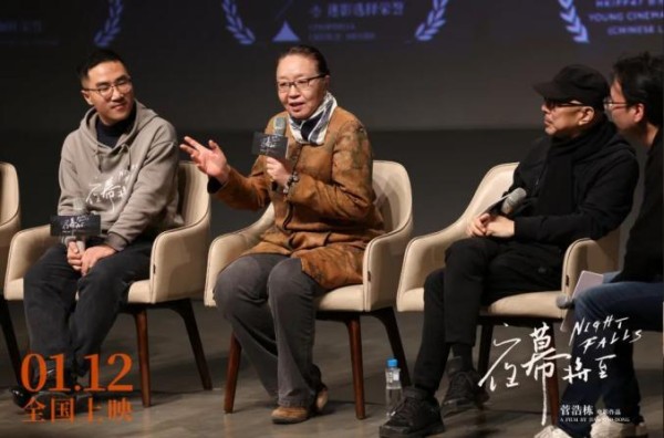 戴锦华和王红卫在映后交流环节中,对《夜幕将至》给予了高度评价。王红卫对影片赞不绝口,并在现场透露了一个重要信息:平遥国际电影展将费穆荣誉最佳影片殊荣颁给《夜幕将至》,这是所有评委们一致的选择,毫无异议。“当我看到《夜幕将至》的时候,我个人是蛮意外的,因为我之前不知道有关这个片子的任何信息,也没有听过圈内人对导演本人作品的评价。”这和其他不少青年导演已经通过求学、短片、创投等经历被业内了解很不一样。王红卫认为,电影《夜幕将至》在意象表达上非常有深刻,导演菅浩栋并没有按照某类影展去拍摄这部影片,也没有迎合和附和电影节的评审,是一部非常值得肯定的作品。据菅浩栋介绍,在领奖后他得知,这部电影的颁奖词也是由王红卫撰写——在回家的漫长旅程中走入记忆,在老人的葬礼前先埋葬自己,往事并未出现却无比清晰,悲伤还未降临却必然如约而至。叙事自然有力,镜头朴素准确,角色塑造和表演控制自洽于风格,情绪表达内敛但充沛,显示出超越导演年龄和经验的沉稳笃定。