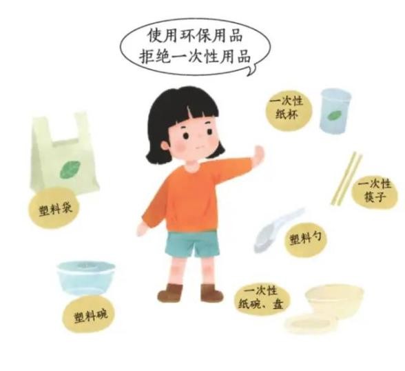 日常生活中的一次性用品是指只能使用一次的各类生活用品。一次性用品不仅消耗大量的自然资源,而且还会导致生活垃圾增加。在日常生活中,我们要多使用环保用品,尽量减少一次性用品的使用。如在外就餐时,尽量减少一次性餐具的使用;外出自带水杯,尽量减少一次性水杯的使用;外出购物,自带购物工具( 如篮子、提包等),尽量减少一次性塑料袋的使用等。