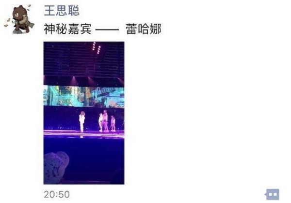 据说今年的门票虽然很贵,但是场内的座位却是一团乱,很多人都是先到先得随便坐,以至于迟到的人就没有座位了,据说王思聪就是站着看秀的。网上还有一条疑似王思聪的朋友圈说:神秘嘉宾---蕾哈娜。就在这条朋友圈下面王思聪又评论了自己:转过来了,发现是张靓颖。真是很幽默呢,国民老公真是承包了大家一晚上的笑点啊。