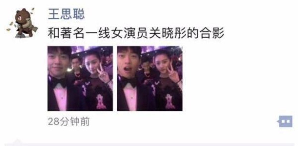 继认错张靓颖之后,王思聪又和关晓彤合照,还称她为著名一线女演员,又让大家爆笑连连。黄晓明教主还评论了他说:完了完了完了,你要火了。没想到真的火了,国民老公竟然还有这么幽默的一面。