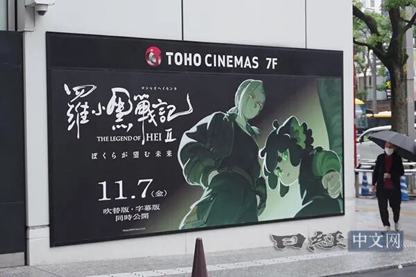 在东京上野的影院“TOHO Cinemas UENO”门前,张贴着《罗小黑战记2:我们所期望的未来》(日语名:「羅小黒戦記2 ぼくらが望む未来」)的巨型海报。这部中国国产动画电影计划于11月7日起,在日本全国约150家影院上映。路过的行人不时停下脚步,驻足观看海报。该片是2019年上映的《罗小黑战记》的续集,讲述的是前作两年后的故事。