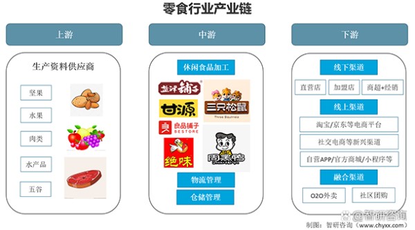 休闲食品产业链包括上游生产资料供应商,中游休闲食品加工、物流管理、仓储管理等,以及下游的销售渠道或终端消费者。
