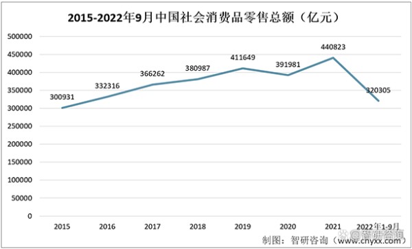 2015-2022年9月中国社会消费品零售总额(亿元)