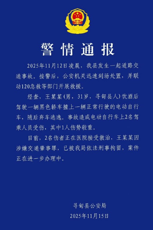 经初步调查核实,该事故系31岁寻甸县男子王某某,在饮酒后驾驶一辆黑色轿车上路行驶,途中与一辆正常行驶的电动自行车发生猛烈碰撞。事故发生后,王某某未停留参与救援,而是选择弃车逃离现场。此次事故导致电动自行车上两名驾乘人员不同程度受伤,其中一人伤情较为严重。截至通报发布时,两名伤者均已被送往医院,正在接受专业救治。目前,王某某因涉嫌交通肇事罪,已被寻甸县公安局依法执行刑事拘留,该案件后续调查及办理工作正在有序推进中。