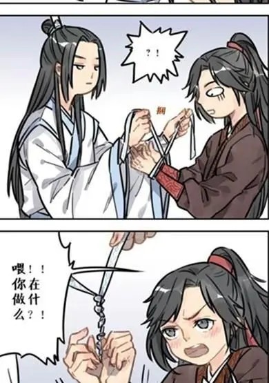 还是《魔导祖师》里面的哟,这一对大家非常的熟悉吧?就是我们官方cp魏无羡和蓝忘机,这是一话小漫画中的场景,蓝忘机用自己的头绳将魏无羡的双手捆绑起来,气的魏无羡直跳脚,那个时期大概是他们少年吧!还是比较无忧无虑的时期,被绑住的魏无羡很可爱啊!