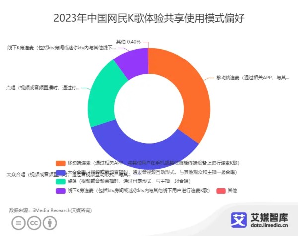 iiMedia Research(艾媒咨询)数据显示,在2023年中国网民K歌体验共享使用模式偏好中,35.20%消费者会选择大众合唱(视频或音频直播时,通过音视频互动形式,与其他观众和主播一起合唱),34.80%消费者会选择移动端连麦(通过相关APP,与其他用户在手机或其他智能终端设备上进行连麦K歌),20.00%消费者会选择点唱(视频或音频直播时,通过付费形式,与主播一起合唱),9.60%消费者会选择线下K房连麦(包括ktv房间或迷你ktv内与其他线下用户进行连麦K歌),0.40%消费者会选择其他。