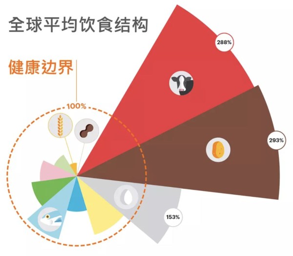 至于这个饮食模式中的第二个重点——食物可持续生产,涉及六个方面:温室气体(甲烷和氧化亚氮)排放量、氮素施用、磷素施用、用水量、耕地面积、物种灭绝速度。以这六大边界为准,食物生产给环境带来的压力已经全面超标,问题最严重的三个方面是生物多样性损失(物种灭绝)、氮磷施用及气候变化(温室气体排放)。