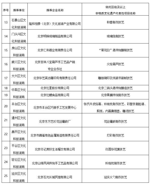 新京报讯 据北京市文化和旅游局消息,日前,北京市文化和旅游局发布通知,认定北京工美集团有限责任公司、北京市丰台区巧娘手工艺发展中心、北京石光长城民宿有限公司等首批25家北京市非遗工坊。