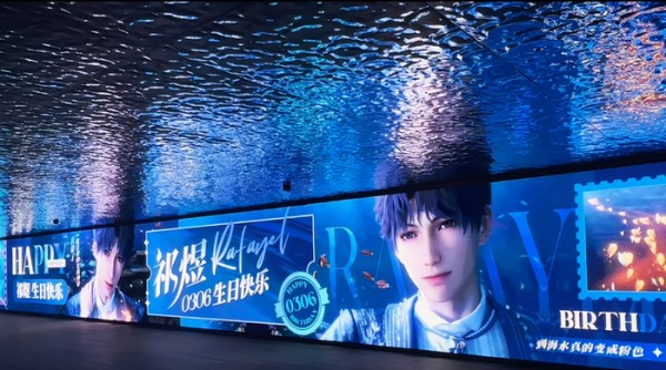 “痛楼”应援则是更高阶的玩法。玩家们通过社群众筹或个人应援,拿下商业大楼外墙LED 屏、地铁广告位等资源,投放角色生日贺图或视频。以《恋与深空》祁煜生日应援为例,活动覆盖国内 850+商场、1000 家大屏。