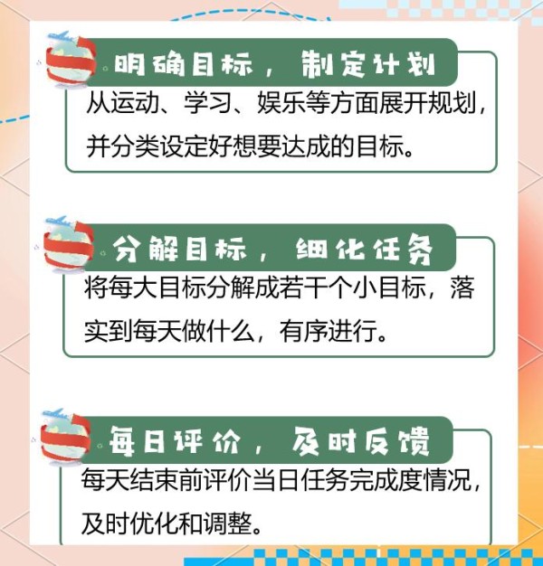 通过明确计划与制定目标,我们可以更清晰地看到自己的方向;进一步将目标分解并细化成每日任务,能让我们在行动上更有抓手;而每日的评价与反馈,则如同一面镜子,帮助我们及时调整,保持最佳状态。这样的三步走方法,无疑将增强我们对生活的掌控感和确定感,使我们更加从容地面对假期的每一天。