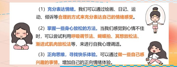 调整情绪。通过“当……(具体事件发生),我感觉……(情绪体验),我需要的是……”这样的句式,我们可以更清晰地认识到自己未被满足的需求。在此基础上,选择合适的方法来调整情绪,如深呼吸、冥想或与朋友倾诉等,帮助自己逐步走出情绪的困扰。