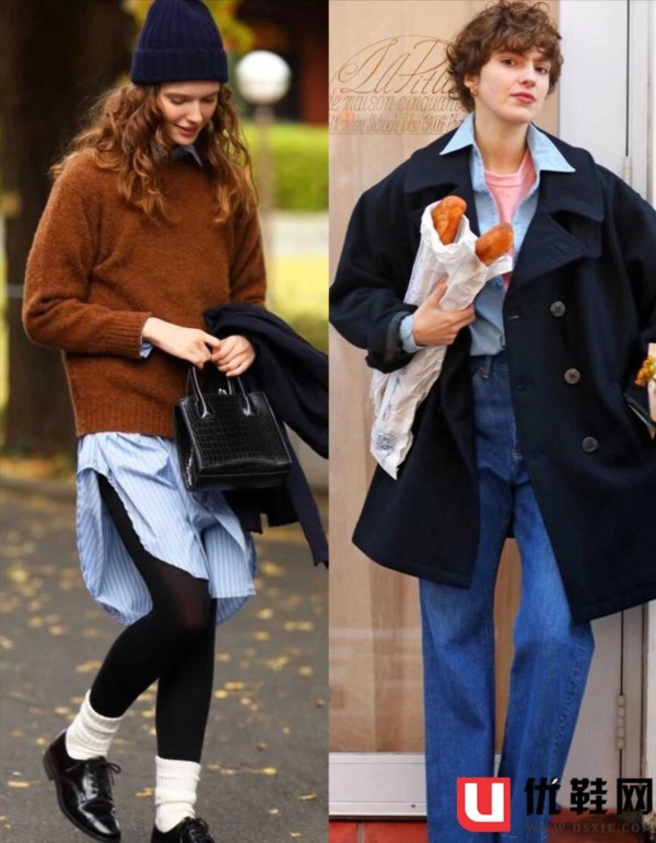 肚子大、臀大胯大的女生就可以参考左侧的穿搭,用长一些的衬衫裙叠穿针织衫,刚好把最尴尬的显胖部位全遮住,又多了一些小清新的感觉。