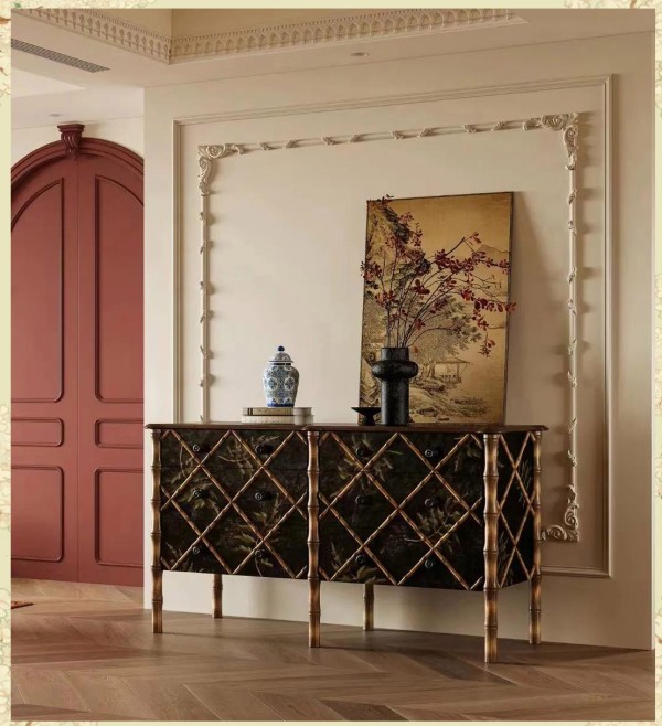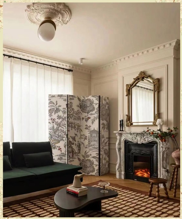法式复古风格以其独特且精美的纹饰而闻名,这些纹饰为空间增添了一抹浪漫且奢华的格调,使得每一处细节都仿佛是经过精心雕琢的艺术珍品。在设计中,这种风格追求的是心灵的归宿感,透露出一种难以抗拒的浓郁气息。因此,在壁纸、窗帘、靠垫、地毯以及床上用品上,你常能见到那些经典的植物和花卉纹样,例如卷草纹、藤蔓纹,以及玫瑰和郁金香等图案。正是这些纹饰的巧妙运用,使得整个居室弥漫着浓厚的艺术氛围,法式复古的深邃韵味也得以充分展现。