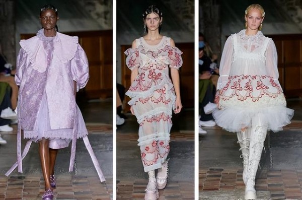 其实,复古风的流行不是赤裸裸地复制历史,几十年前的服装款式和流行元素在当今重新流行,都是以一种新的形式出现,细节的处理和面料工艺上都会有变化。如:我国汉服的宽袍大袖过于拖沓笨拙,无法适应当代对于服装舒适便利的要求,欧式宫廷服装中的束腰元素因对女性的身体有着极大损害,这些元素无疑不适合用于当代时装设计中。所以,当代复古风格的设计,是设计师借用古典服饰中可以利用的经典元素,将其巧妙的运用于当代的时装设计中来,营造出一种既富有历史韵味又具有时代个性的服装风格,从某种程度上讲,复古风格就是借用曾经的经典进行设计和创新。如童年时代公主般梦幻的泡泡袖再度出现在我们的眼前时,已经是对肩部工艺结构做了新的处理,呈现出一种硬朗中不失可爱的风格形式(图4)。 SIMONE ROCHA 2022 秋冬秀场,其中泡泡袖连衣裙和夸张的薄纱、精致且夸张的荷叶边等凌厉设计,非常好的继承了泡泡袖和蓬蓬袖的复古元素。