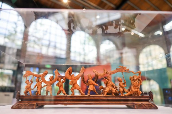 始于20世纪30年代的黄杨木雕,结合民间雕塑技艺和西洋素描技法,具有典型海派特色。此次展厅中央展出徐宝庆作品《狮舞龙腾》,利用数字技术放大局部细节,提供多维观赏角度。展览还汇集多件黄杨木雕代表性作品,囊括老中青三代艺术家,主要选材鲜活的市井生活,让传统技艺在新时代继续绽放绚丽光芒。