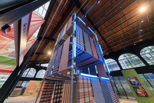 《环环相扣》崇明土布公共艺术装置与崇明三民文化村共同创作。高大的架子上,一匹匹崇明土布回环交织。崇明土布源于元末明初,是一种以平纹组织形式为主的棉纺织物,质朴、厚重,兼备保暖和透气功能,是寻常百姓家最常见的布料。一块土布从棉花开始,需要经过轧、弹、擀、纺、染、经纱等十多道工序后,最后才能上机编织。崇明土布大部分以蓝色调为主,配色雅致,经纬纵横交织出各式各样图案,主要有芦扉花、井字纹、秤星布、喜字纹等。