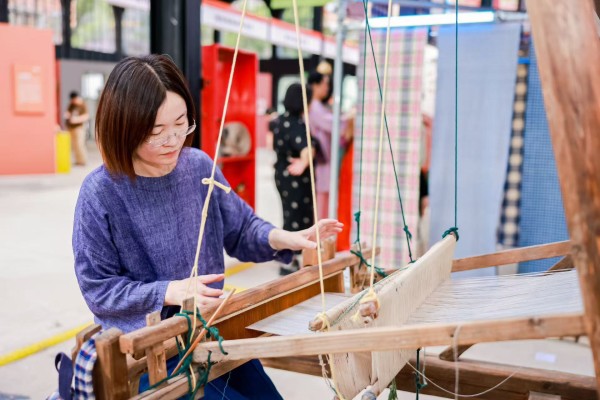 崇明织带区级传承人宋荣耀在现场为观众演示织布。与从小耳濡目染学习织布的崇明老人不同,宋荣耀2008年才开始接触土布。“那时很多人家中还有保存的老土布,但大家都觉得没什么用。我很喜欢这些土布,拿来做成包包等小物件,很多人都喜欢。”因为这个契机,宋荣耀放弃了体制内的工作,成立了团队,带着阿姨们做手工。如今机织布盛行,手工布费时费力,早已脱离日常生活需要,但宋荣耀觉得,手工织布可以作为一种艺术创作继续存在,“手织布非常个性化,可以随时变化不同的花色,不像机织布,设定好之后可能几千米都是织造相同的花色,所以我觉得这是一件非常有意思的事,慢慢地,我带着大家一起去做,也就变成一件非常有意义的事。”