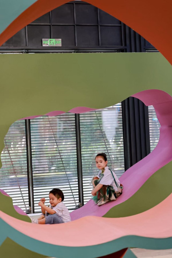 小朋友在金山农民画风格的“南汇水蜜桃”“马陆葡萄”等蔬果装置上玩耍