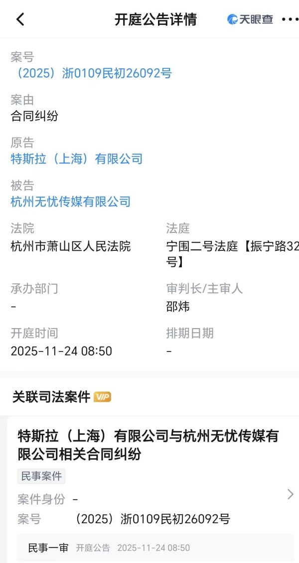 11月18日消息,据天眼查APP显示,特斯拉(上海)有限公司与杭州无忧传媒有限公司(下称无忧传媒)的合同纠纷案将于11月24日在杭州市萧山区人民法院开庭审理。此次诉讼的核心争议围绕7761元新能源汽车补贴的退还问题展开。