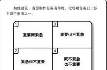 最后:区分目标。目标重要的是实施,列出所有需要当期实施的目标任务清单。按照斯蒂芬•柯维在《高效能人士的七个习惯》一书中给出的著名“时间四象限”方法,将列出的目标任务清单中区分出那些是重要、那些是紧急的,优先去做自己认为重要且紧急的任务,每天预留一些时间,去应付那些紧急但不重要的事情。