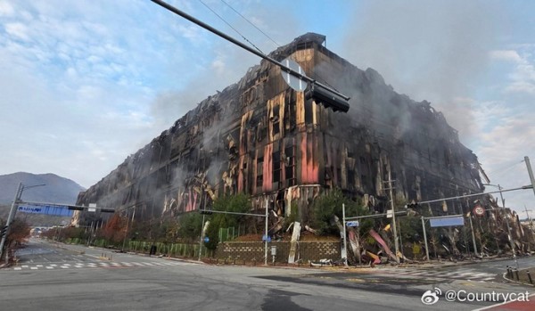 韩国忠清南道天安市的衣恋集团(E-LAND)时尚物流中心于15日清晨6时08分起火,火势一直延烧至下午3时30分才基本得到控制,但截至目前仍未完全扑灭。整个物流中心如今被烧成一片焦黑废墟,大量库存货物付之一炬。