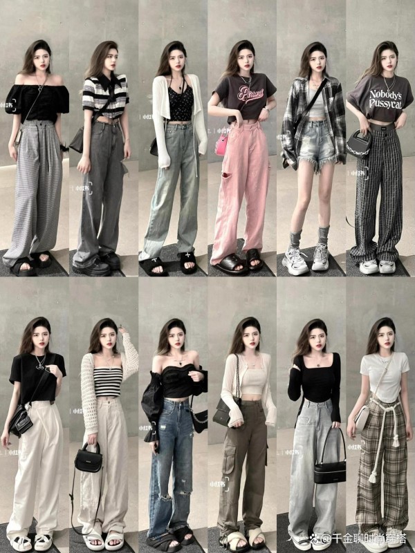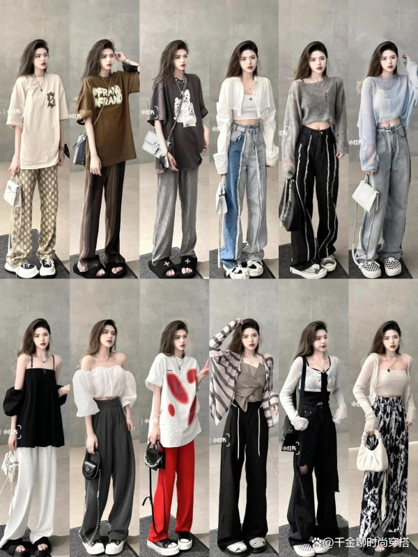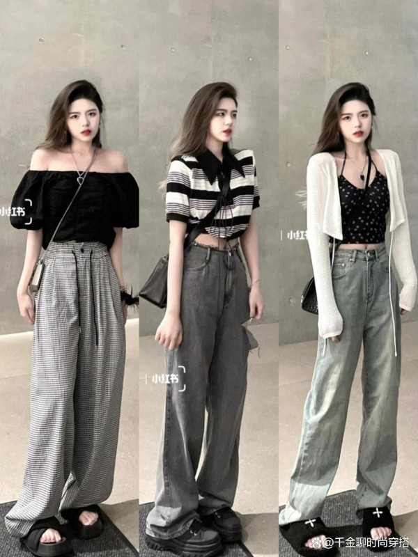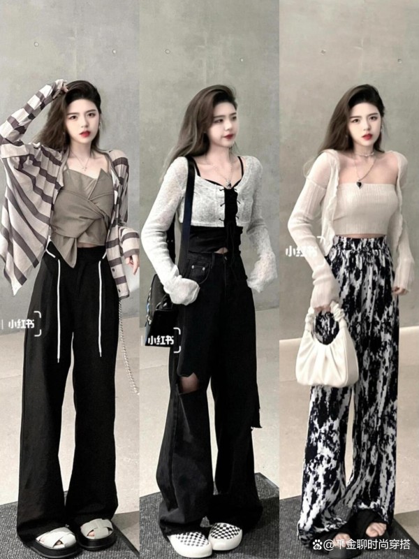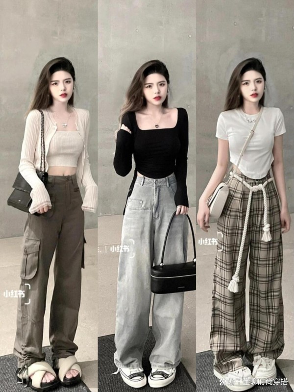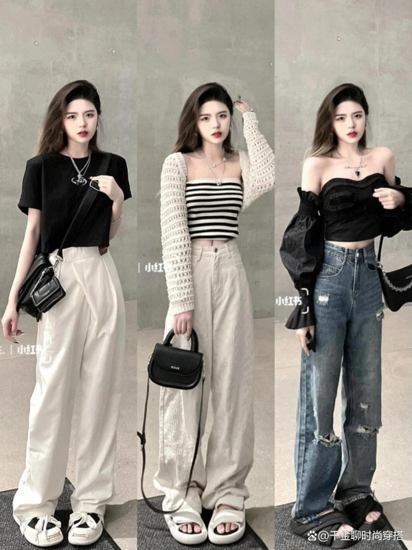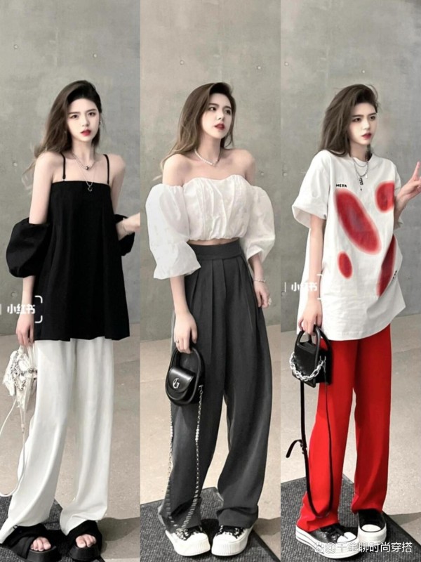 • 亮色点睛:粉色阔腿裤配深灰短上衣,柔与刚碰撞;红色长裤+白T,秒变街头达人,活力爆棚~