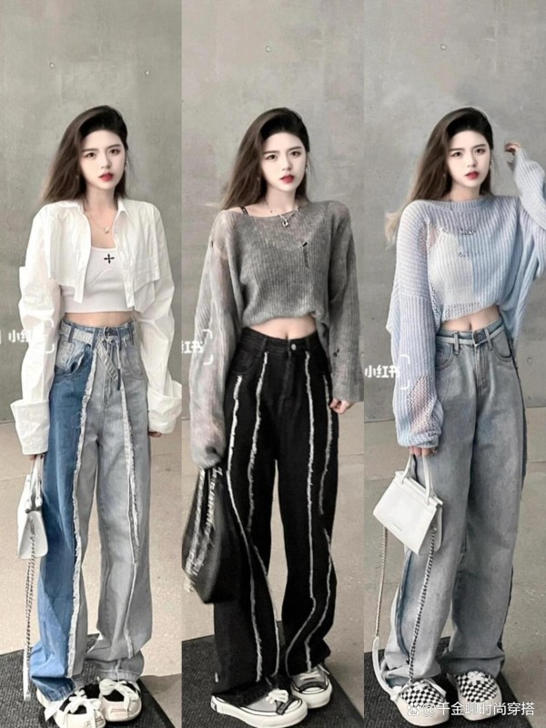 • 破洞&毛边:牛仔裤的破洞、毛边,是街头“身份证”!膝盖大破洞配短上衣,叛逆又时尚;裤脚毛边随步伐摆动,主打一个“不完美的酷”~