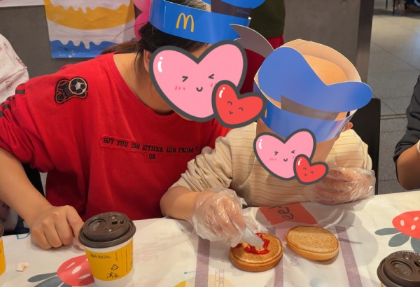 活动当天,麦当劳门店被精心布置成温馨的互动空间:活动区备齐彩色卡纸、安全剪刀等手工材料,操作台上整齐摆放着汉堡胚、生菜等食材,工作人员身着卡通围裙,营造出轻松愉悦的氛围。下午2时许,家长带着孩子们陆续到场,在工作人员和志愿者的引导下投入到各项活动中。