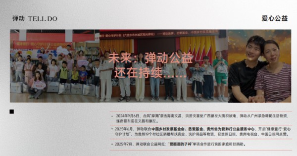 自2019年成立以来,弹动品牌始终积极履行企业社会责任,面向不同群体开展多样化的公益行动。2024年9月,台风“摩羯”袭击海南文昌并引发广西崇左洪涝,弹动从广州紧急调配生活物资,连夜送往灾区;2025年6月,联合中国乡村发展基金会等多方机构启动“健康童行-爱心守护计划”,向贵州19个村社捐赠洗护用品;2025年7月,又与公益网红“爱画画的子衿”合作,开展贫困家庭帮扶。