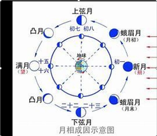 月相不是由于地球遮住太阳所造成的,而是由于我们只能看到月球上被太阳照到发光的那一部分所造成的,其阴影部分是月球自己的阴暗面。盈为圆,亏为扁,形象的指月球的圆缺变化。