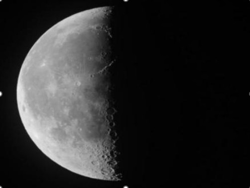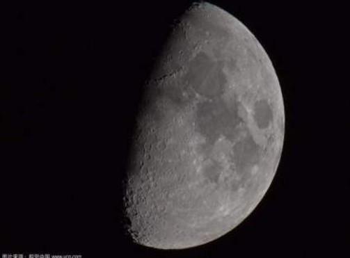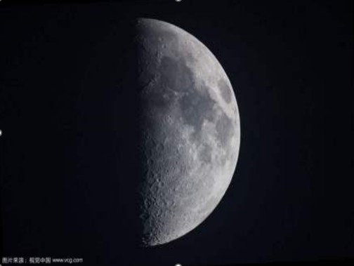 约在农历每月初七、初八,月球绕地球继续向东运行,月地连线与日地连线成90度。地球上的观察者正好看到月球是西半边亮,呈半圆形叫上弦月。假设观察者位于北半球中纬度,则上弦月约正午月出,黄昏时,它出现在正南天空,子夜从西方落入地平线之下。