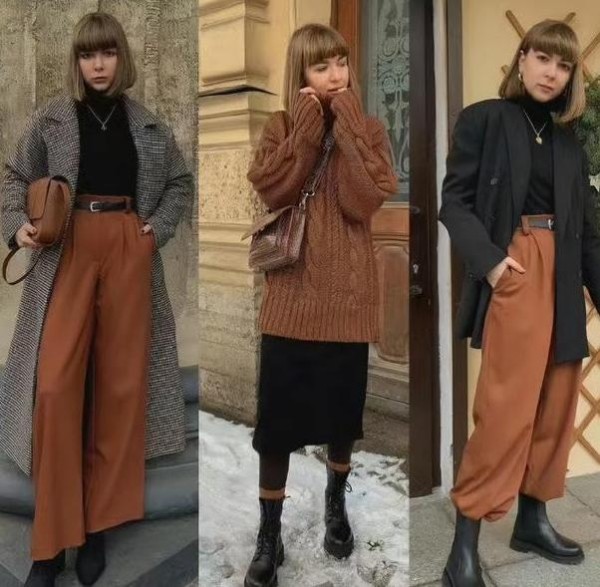 衣服的款式也能够穿出高级感。一件简约的外套搭配上黑色的针织衫和咖色的长款裤子,宽松的版型让人的双腿看上去更加纤长笔直,展现出欧美风格的时尚魅力。这样有层次感又有氛围感的穿搭非常吸睛,是秋冬季节喜欢复古且高级风格的不二选择。