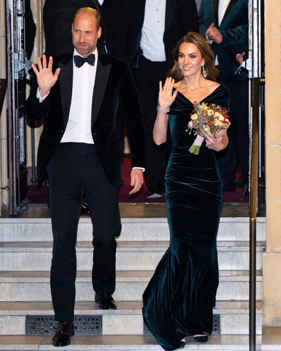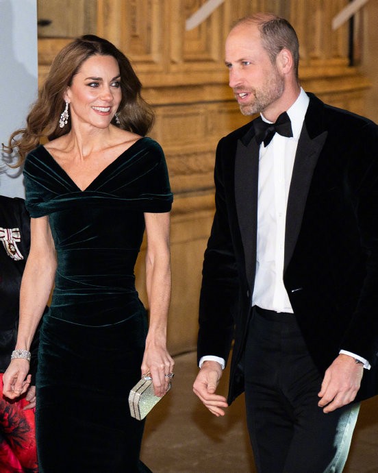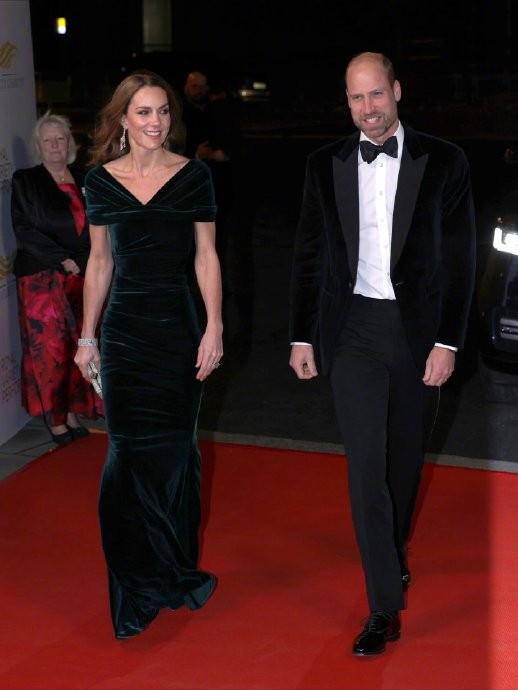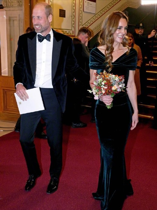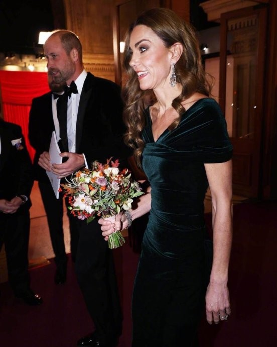 威廉王子和凯特王妃现身皇家阿尔伯特音乐厅出席皇家综艺表演。这是时隔两年两位首次一同亮相这个活动。凯特穿着Talbot Runhof 深绿色丝绒礼服,佩戴Garrard 蓝宝石钻石订婚戒指、卡地亚 Etincelle De Cartier 婚戒、Annoushka Eclipse 钻石戒指和Wartski 威尔士金婚戒,Greville 吊灯耳环,佩戴玛丽王后项圈式手链,脚穿Manolo Blahnik 天鹅绒 高跟鞋。 很优雅的一身造型,她的身形非常适合这种礼服。#时尚灵感解读##时尚头排客##米拉服饰解析#
