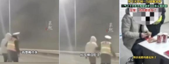 1月22日,湖北武汉,男子因跟同事发生争吵,一气之下决定不吃不喝,从武汉徒步走回老家襄阳,在快速道上被民警通过视频监控发现。听完男子的叙述后,民警表示:“你走反了。”民警随后把他送上了到襄阳的火车。