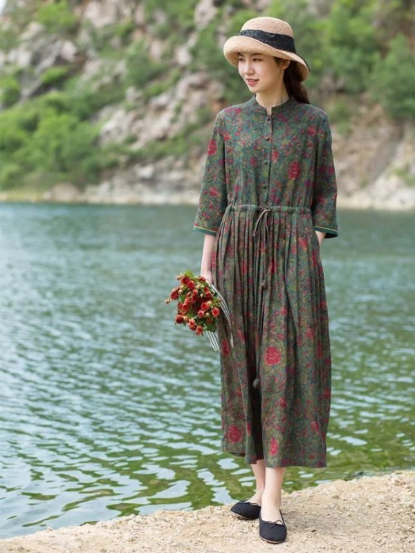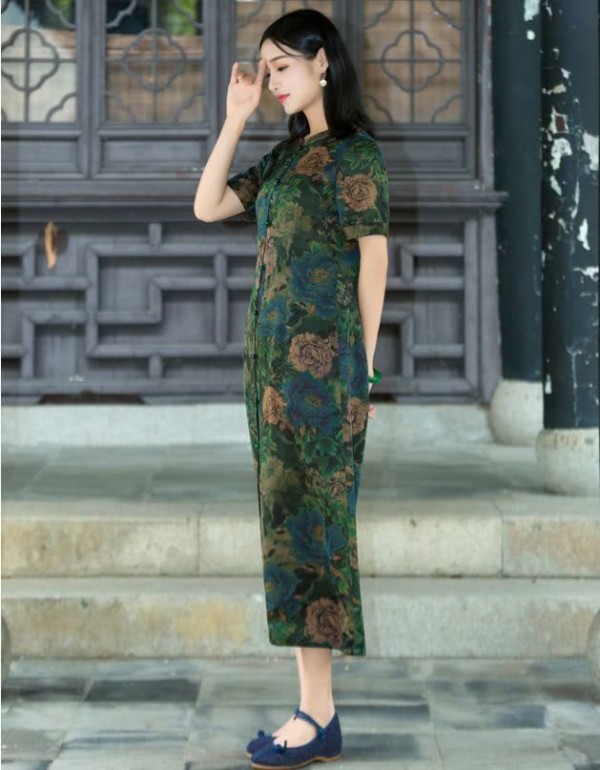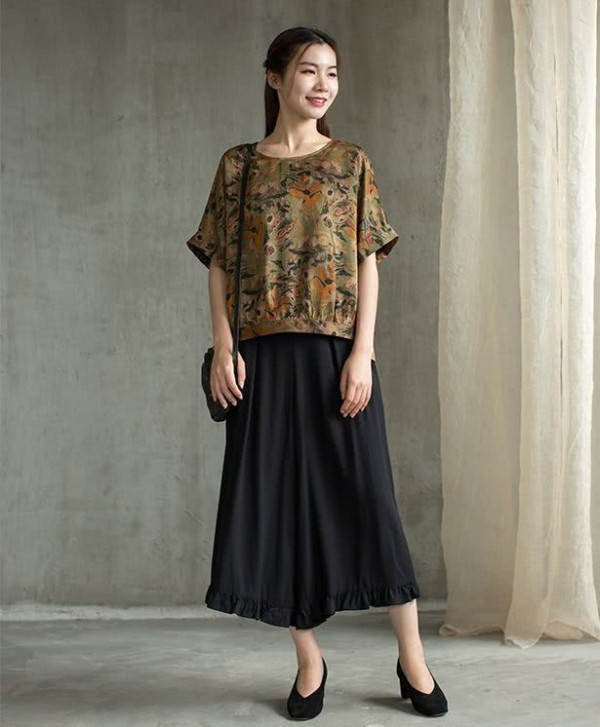 香云纱通常结合上了盘扣以及印花的设计,有着中国那种意境美的感觉充满浪漫气质,造就一种不可替代,宽松大方的版型可以遮盖住肚子,修饰梨型身材、苹果型身材等,塑造优美曲线,而改良旗袍式的斜襟处理也是让人过目不忘,上身舒适又有气质。上身质感满满,可以提升你的气色,即使你的肤色是小麦色也无妨。出门时搭配一款一字带高跟鞋即可。
