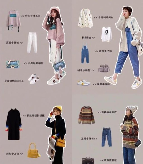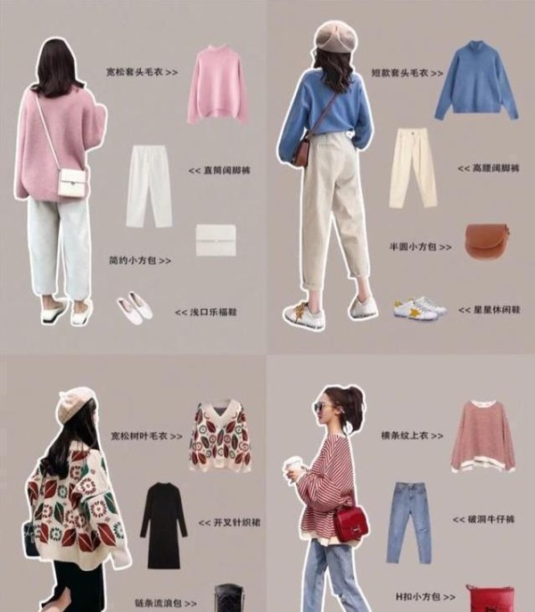 粉色针织上衣+白色直筒裤+白色单鞋;蓝色针织上衣+杏色直筒裤+小白鞋;宽松印花毛衣开衫+黑色针织连衣裙打底+橘色帆布鞋;红白横条纹上衣+蓝色牛仔裤+白色运动鞋
