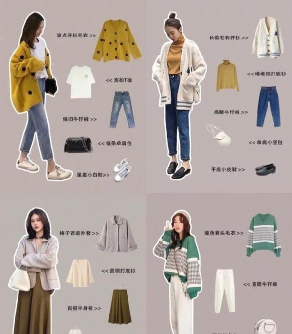 黄色黑点毛衣开衫+白T恤+宽松牛仔裤+小白鞋;白色毛衣开衫+打底衫+高腰牛仔裤+黑色乐福鞋;灰色西装外套+杏色T恤+百褶黄绿色半身裙+白色平底小皮鞋;绿白撞色条纹针织上衣+小白裤+小白鞋