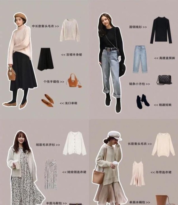 白色毛衣+A字半身长裙+棕黄色尖头单鞋;黑色打底衫+高腰直筒裤+黑色高跟鞋;黑白波点连衣裙+白色针织开衫+系带小皮鞋;白色宽松针织衫+吊带连衣裙内搭+米色浅口单鞋