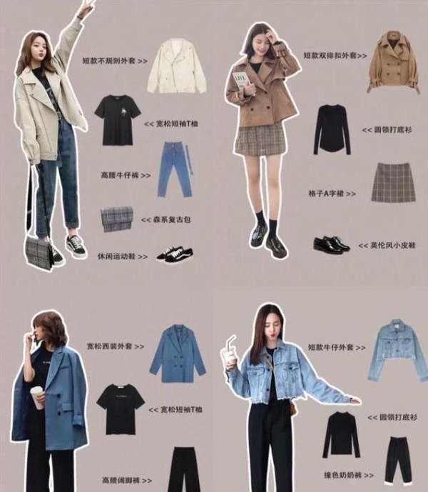 米白色皮衣外套+黑色T恤+高腰牛仔裤+黑色板鞋;卡其色短款风衣外套+黑色打底衫+棕格纹A字小短裙+英伦风小皮鞋;蓝色西装外套+黑色T恤+黑色阔腿裤+小白鞋;蓝色牛仔短外套+黑色打底衫+黑色阔腿裤+白色乐福鞋