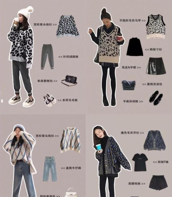灰色豹纹黑色针织衫+灰色阔腿裤+黑色帆布鞋;黑色豹纹小马甲+黑色衬衫+A字皮短裙+黑色小皮鞋;竖条纹套头针织衫+休闲牛仔裤+白色板鞋;深蓝色豹纹开衫+黑色T恤+黑色短裤+黑色春款打底裤+黑色系带小皮鞋