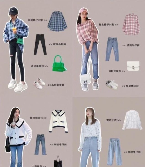 经典蓝白格纹衬衫+黑色破洞小脚裤+白色老爹鞋;经典红白格子衬衫+直筒破洞牛仔裤+小白鞋;白色娃娃领开衫+喇叭牛仔裤+白色乐福鞋;白色波点雪纺上衣+高腰牛仔裤+小白鞋