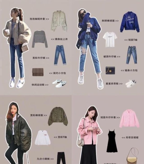 卡其色泡泡袖外套+黑白条纹打底衫+宽松牛仔裤+白色运动鞋;蓝色棒球服外套+白T恤+蓝色破洞牛仔休闲裤+小白鞋;墨绿色棒球服外套+白T恤+黑色紧身弹力裤+白色老爹鞋;粉色牛仔小外套+黑色吊带百褶裙+深棕色平底小皮鞋