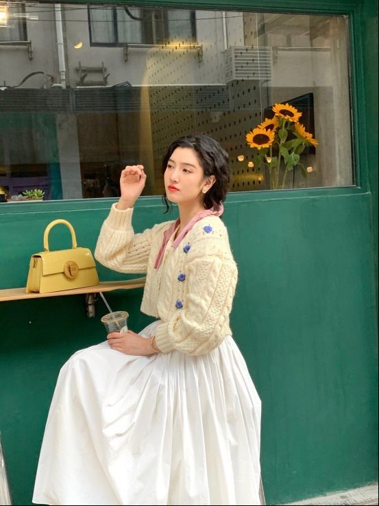 在选择针织衫时,如果我们想要更多的体现甜美气息的话,可以尝试一些带有可爱元素的针织衫,例如刺绣元素或者是蕾丝元素,会使整体造型更加甜美俏皮,一件白色刺绣短款针织上衣搭配黑色短款伞裙,穿出了复古宫廷风的气息,又甜又欲,十分迷人,俏皮可爱又气质满满。