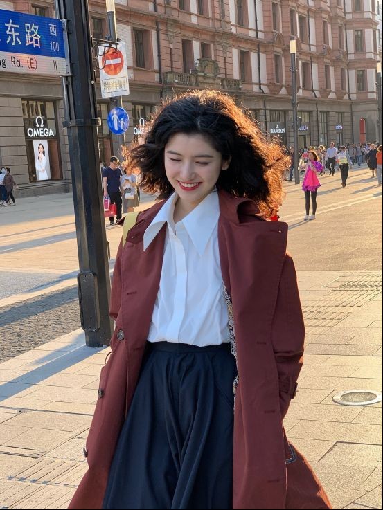 一件砖红色的A字型风衣搭配白色衬衣和黑色半身裙,整体穿搭不超过三个颜色,既保证了色彩的丰富度,不显得单调,又体现出了优雅低调的气息,显得十分稳重大方。