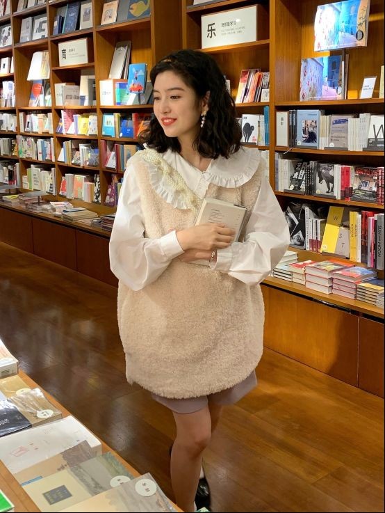 秋冬季节想要在穿搭上面打破沉闷感,可以试试叠穿的搭配方式,一件白色娃娃领衬衣搭配米色V领针织马夹,显得俏皮可爱,平添了几分慵懒妩媚的气息,更显魅力。